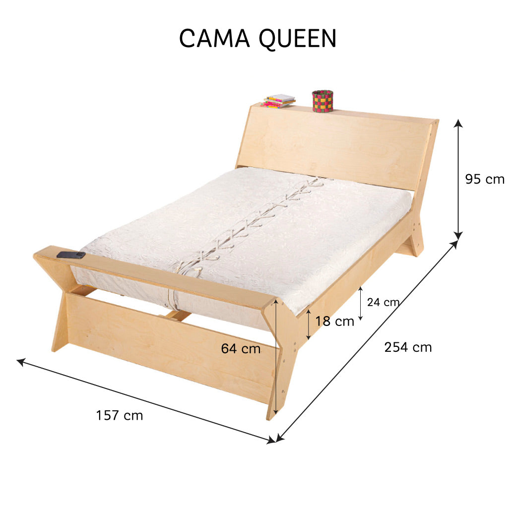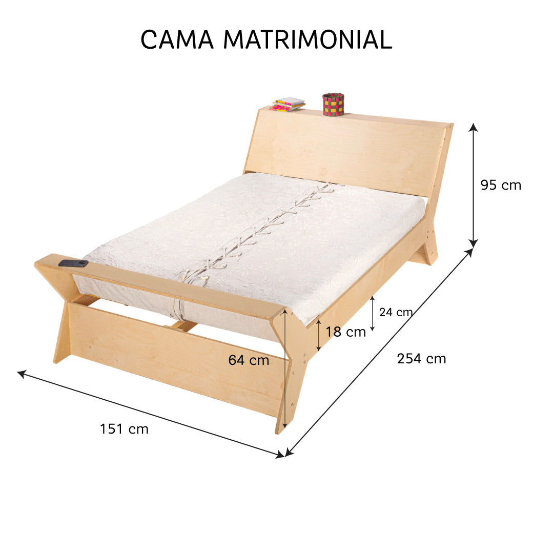 Individual: • Largo: 192 cm • Ancho: 145 cm • Ancho (donde descansa colchón: 139 cm) • Alto: 149 cm Matrimonial: • Largo: 192 cm • Ancho: 151 cm • Ancho (donde descansa colchón: 145cm) • Alto: 149 cm Queen: • Largo: 192 cm • Ancho: 157 cm • Ancho (donde descansa colchón: 151 cm) • Alto: 149 cm |