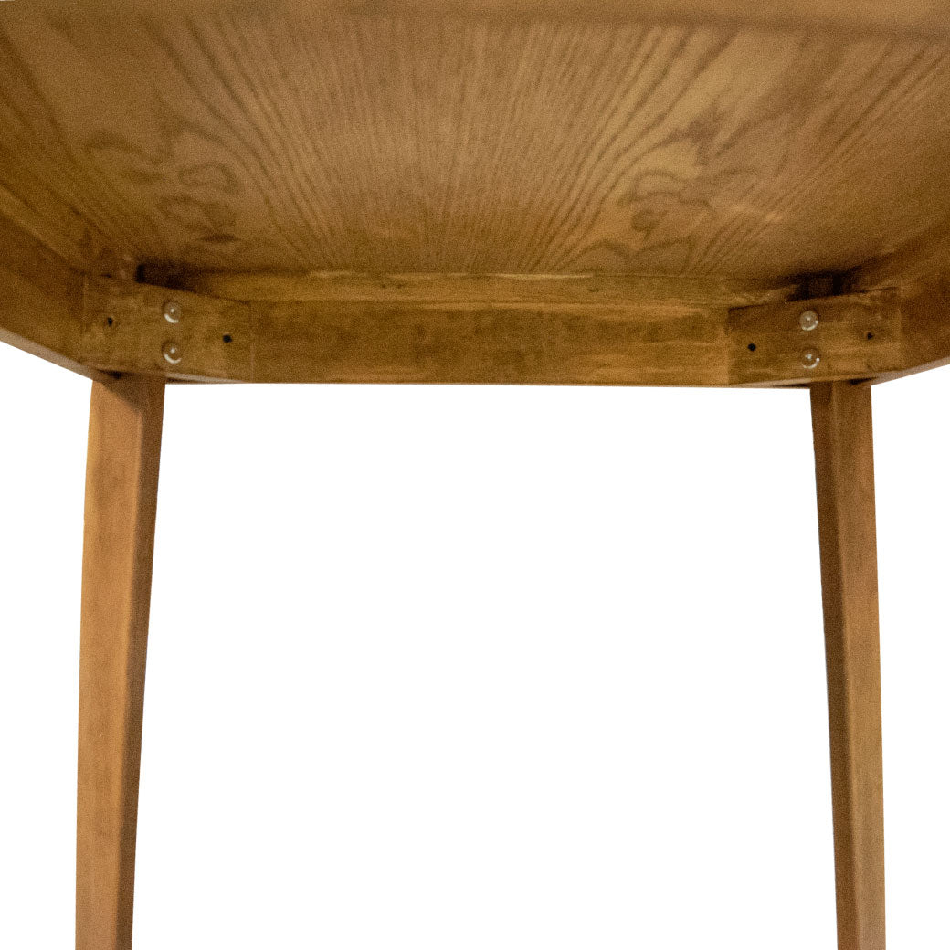 Fabricada en madera sólida con acabado entintado, destaca por su tono cálido y su veta natural visible. Su diseño con patas firmes y ligeramente abiertas brinda estabilidad y un estilo contemporáneo que combina con diferentes tipos de sillas.