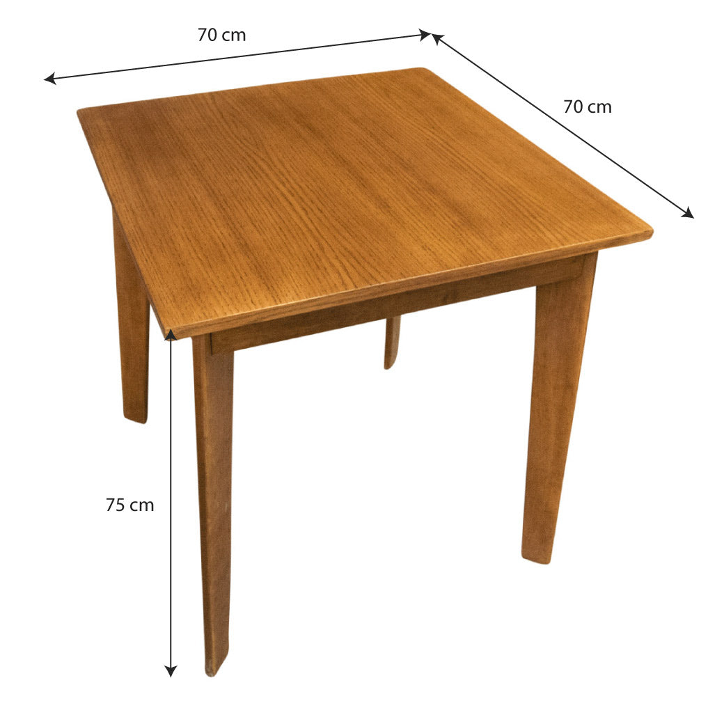 El tamaño cuadrado la hace práctica para espacios reducidos sin sacrificar comodidad. Perfecta para departamentos, cocinas, comedores pequeños o espacios donde se busca diseño, calidez y buena calidad en madera.